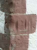 Die Bilder zeigen unterschiedlich große, gut ausgeprägte senkrechte Rillen und Kantenschabungen "an jeweils einem Sandstein-Eckquader links (Bilder 2, 3) und rechts an der Südwand" (Bilder 4, 5).