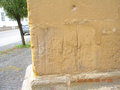 98631 Römhild (Thür., 7km westl. Hildburghausen im gleichnamigen Lks.). Schloss Glücksburg, innerer Schlosshof, got. Spitzbogenportal (nach SW hin): 6 Ritzungen (vgl. Zeilfeld) lks. i. G.